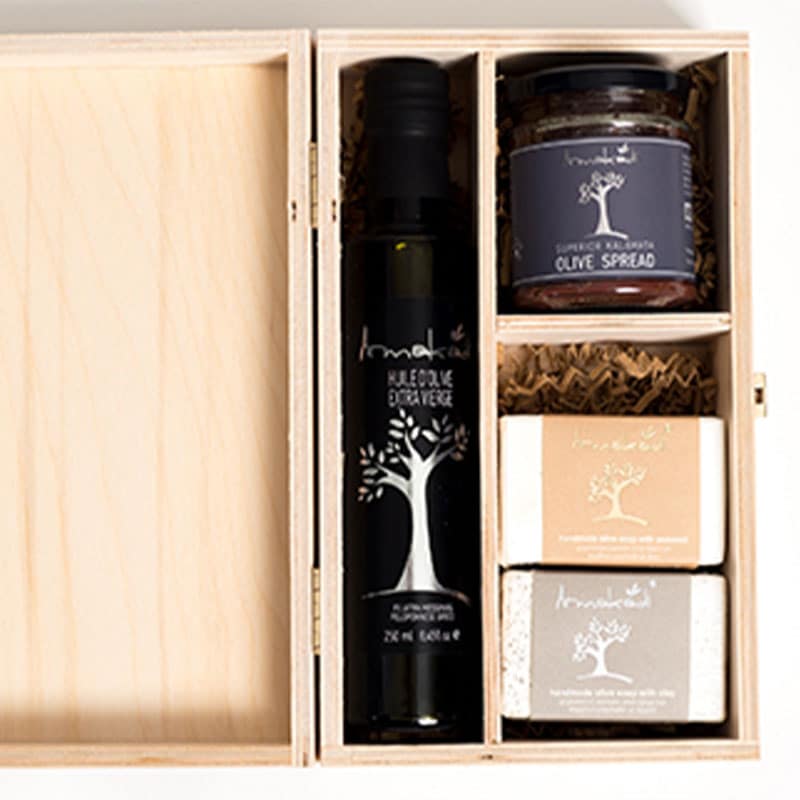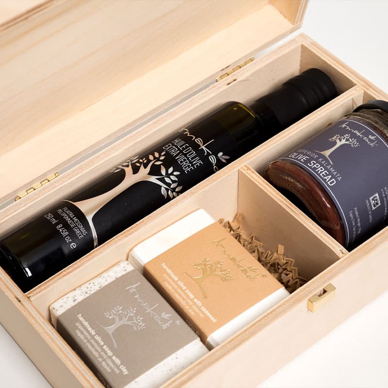 Opakowanie zawiera butelkę z oliwa z pierwszego tłoczenia (250ml), słoik z Pasta z oliwek Kalamata (tapenada) z dodatkiem aromatycznych ziół i czosnku ( 190gr), ręcznie robione mydło z oliwy z oliwek z pierwszego tłoczenia z glinką,oraz ręcznie robione mydło z oliwy z oliwek z pierwszego tloczenia z wodorostami (100gr każde)148
