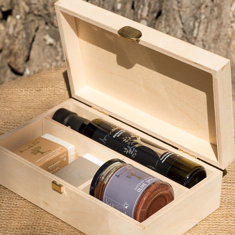Luksusowa, drewniane opakowanie z oddzielnymi pułeczkami i złotym zamknięciem. Zawiera wybór produktów Armakadi. Idealny prezent dla ukochanej osoby lub elegancki wybór dla partnera biznesowego lub współpracownika. Produkt jest dostępny w następujących opcjach: